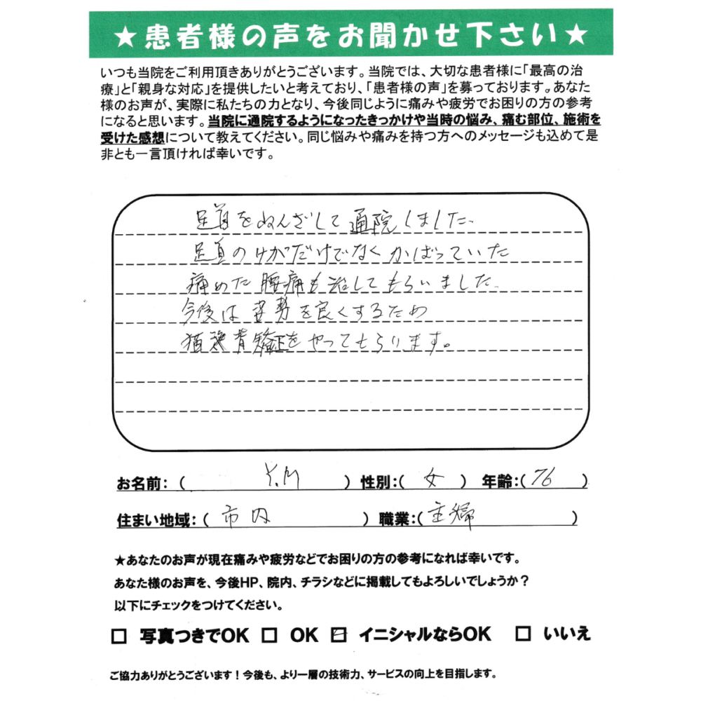 足首をねんざして通院しました。足首のケガだけでなくかばっていた痛めた腰痛も治してもらいました。今後は姿勢を良くするため猫背矯正をやってもらいます。